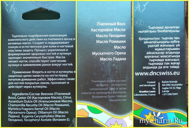 Назначение средства, способ применения и состав на русском языке плюс латынь можно найти на задней стороне. На боковой левой текст напечатан на нерусском языке и на каком именно не указано, поэтому о чем идет речь там, я не скажу вам, но предполагаю, что там продублирован состав. А ниже этого текста адрес, где разрабатывалась формула воска и где его непосредственно производили. Все это я тоже предполагаю логичным путем, т. к. эта информация так же указана на иностранном языке. Можно конечно перевести, если задаться целью, но я такой цели не преследовала)