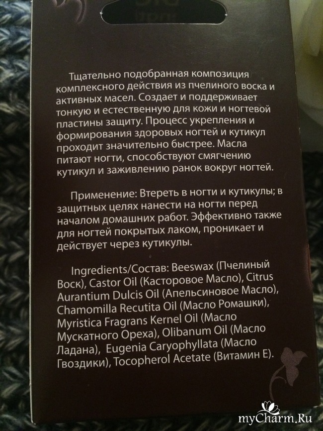 Основной компонент средства это настоящий пчелиный воск. Даже в такой процедуре как парафинотерапия, используется данный ингредиент. Воск прекрасно смягчает кутикулу, укрепляет ногтевую пластину, омолаживает эпидермис, защищает и восстанавливает кожу.