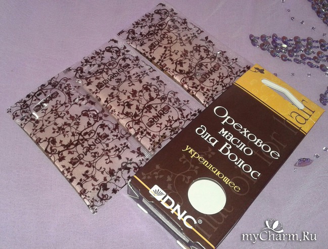 По оформлению этот продукт ничем не отличается от подобных среди масел DNC, ну разве что цвет упаковки желто - коричневый. На передней стороне картонной коробочки имеется знакомое круглое "окошко", благодаря которому можно увидеть пакетик с маслицем. Но таких пакетиков здесь целых 3 штуки, по 15 мл каждый. Так что если использовать это ореховое масло, то получится не одна - две процедуры, а полноценный курс.