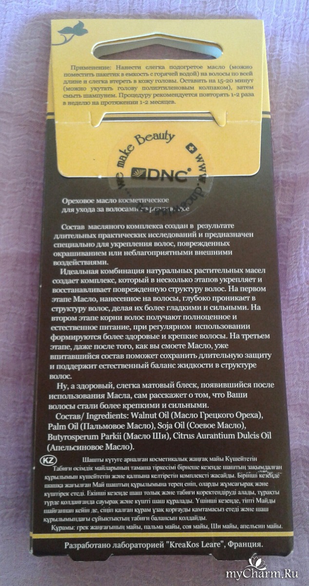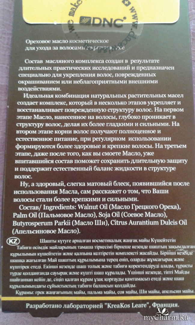 А на обратной стороне картонной упаковки указан способ применения, общее описание и состав Укрепляющего орехового масла. Как всегда, присутствует защитная наклейка, гарантирующая что никто средством до вас не пользовался. Производитель сообщает нам, что данное ореховое масло воздействует на волосы в несколько этапов: сначала оно глубоко проникает в структуру волос, затем питает корни, и на третьем этапе, уже смыв масло с волос, впитавшийся состав сохраняет длительную защиту волос от корней до кончиков на протяжении долгого времени. Как результат - волосы укрепляются, восстанавливается их структура, появляется красивый естественный блеск.