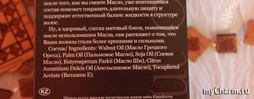 В картонной коробочке находится одно саше объемом 15 мл. Ореховое масло в первую очередь предназначено для укрепления волос. Производитель указывает, что данное масло работает в три этапа: сначала сразу же после нанесения глубоко проникает в структуру волос, делает их гладкими и сильными, затем уже и корни волос получают свою порцию насыщения полезными веществами. На третьем, заключительном, после того, как масло смыто, благодаря впитавшемуся составу поддерживается естественный баланс влаги в структуре волос, а сами волосы выглядят живыми, мягкими и блестящими.