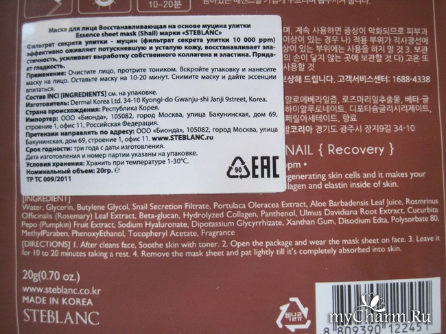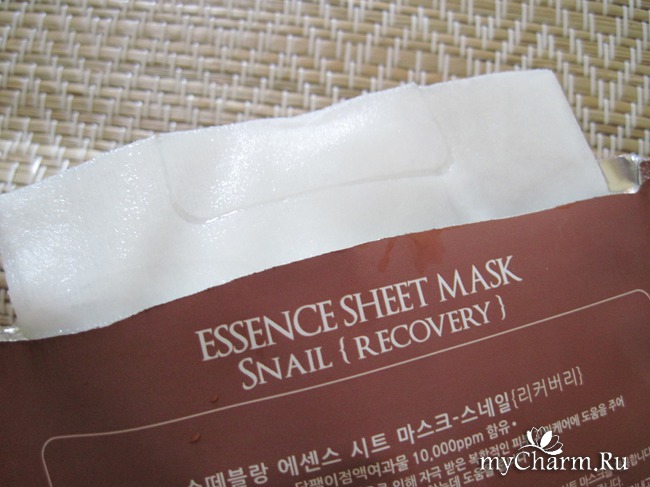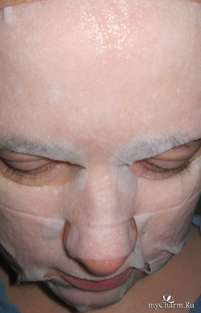 Маска очень щедро пропитана муцинно-витаминным раствором. Наносить ее нужно на очищенное и протертое тоником лицо. Затем нужно на 10-20 минут принять горизонтальное положение. Напоминаю, что в тканевой маске нельзя сидеть у компьютера и расхаживать по квартире. Любая тканевая маска тянет кожу вниз. Так что будьте добры улечься и уделить треть часа своей красоте.