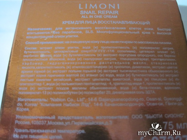 Итак, улиточный крем LIMONI SNAIL REPAIR ALL IN ONE CREAM, что переводится как Восстанавливающий улиточный крем для лица «Всё в одном» от «Лимони».