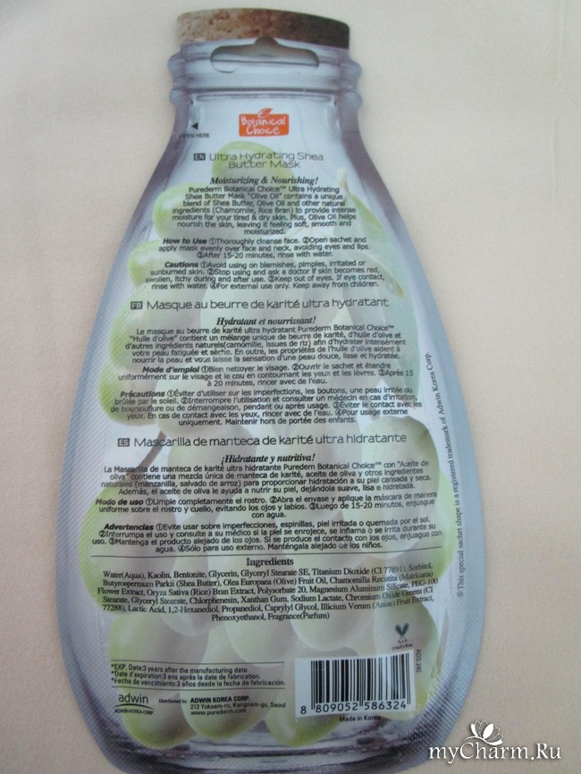 Находится маска в стандартной "бутылочке", характерной только для марки Purederm (Корея). На передней стороне упаковки красуются лицо милой девушки и много олив, кстати, на оборотной стороне тоже нарисованы оливы, только они более светлые. Думаю, чтобы текст был более читабельным.