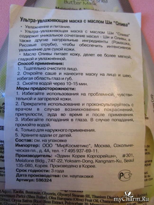 Вот такой красивый состав у маски. К слову, ключевую роль в ультраувлажнении кожи играют, я так думаю, оливковое масло, так как оливы вынесены на упаковку и в название, и масло ши, которое отображено в названии. Да и эти вещества — отличные увлажнители.