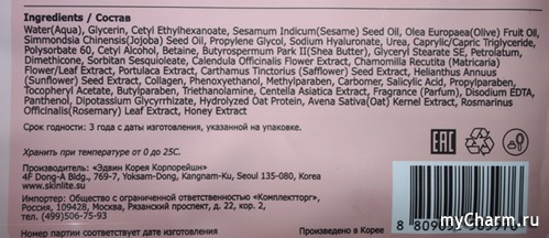Состав радует растительными компонентами: экстракт листьев розмарина, мед, экстракт цветков календулы, экстракт ромашки, масло жожоба, масло оливы, масло семян кунжута и экстракт овсянки. Также в перечень входит множество увлажнителей, коллаген, салициловая кислота и пантенол. В общем, достаточно разнообразный микс всего полезного для кожи рук, но картину портят затесавшиеся три парабена. Я, честно сказать, закрыла на них глаза.