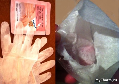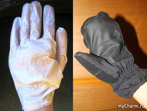 Перед применением желательно тщательно вымыть ручки и даже применить какой-нибудь скраб. Так вы лучше подготовите кожный покров для действия активных компонентов маски. Затем надеваем перчатки. Благодаря внутреннему слою, в них очень мягко и уютно. Состав маски напоминает питательный крем. Поверх масочных перчаток следует надеть теплые рукавички или замотать руки в махровое полотенце и отдыхать в течение получасика. Отличная возможность посмотреть любимую передачу или просто помечтать.