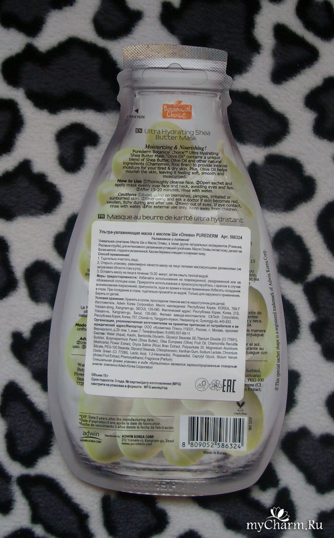 Моя маска оформлена большей частью в зеленых тонах, на лицевой стороне зреют аппетитные оливки. Масло Оливы – один из главных ингредиентов, ухаживающих за кожей, в составе этой маски.