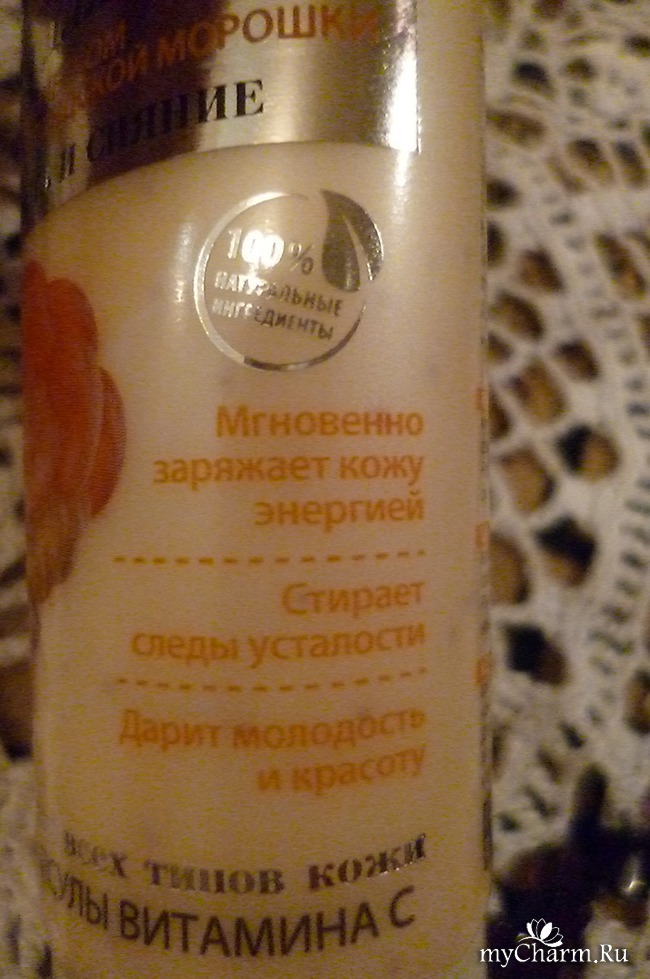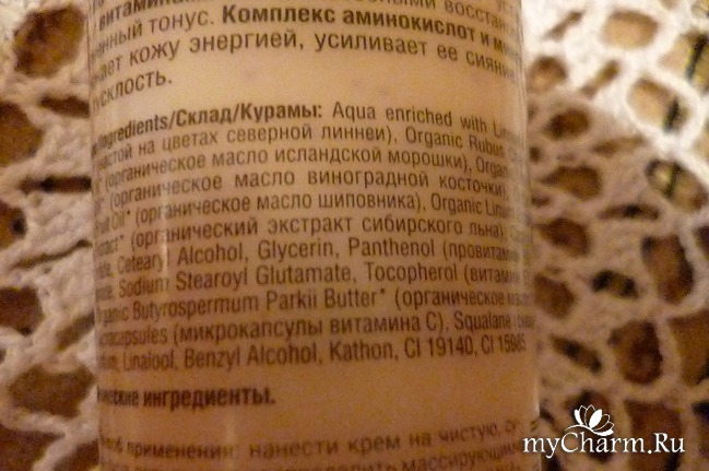 Признаюсь, мне сразу же понравилось то, что синтезированные микрокапсулы витамина С, также заявленные в составе, хорошо заметны в кремовой консистенции, хотя их и не много. Далее состав радует нас наличием настоя на цветках загадочного растения под названием «северная линея», экстракта сибирского льна, провитамина В5, витамина Е.