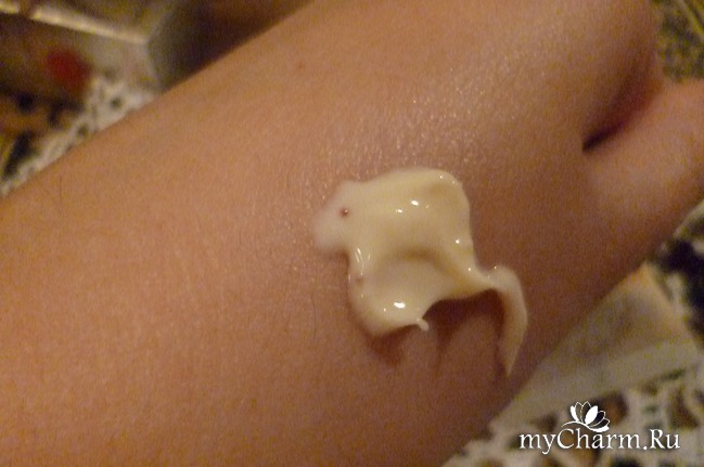 Консистенция крема насыщенная, густая, но при этом не плотная, а достаточно легкая, в меру жирная, с красноватыми вкраплениями витаминизированных капсул. При нанесении от тепла кожи крем начинает слегка подтаивать, что позволяет кремовой консистенции хорошо распределиться и источать приятный аромат. При распределении крема микрокапсулы энергично лопаются и, смешиваясь с кремовой консистенцией, окрашивают ее в слегка розоватый цвет.