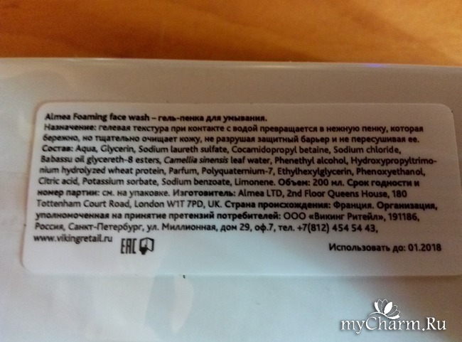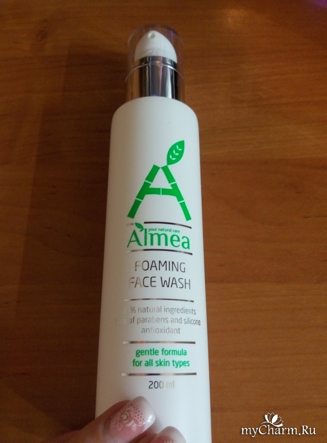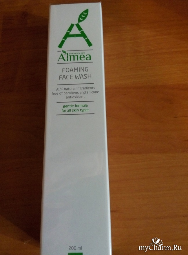 Начнем. Как и вся продукция Almea гель-пенка у пакована в добротную картонную коробку. Цвета использованы белый с серым и зеленым. Лаконично, в стиле всех продуктов производителя Almea. Коробка находится в защитной пленке, что является неоспоримым плюсом. Все надписи на английском языке, но сбоку есть наклейка с переводом.