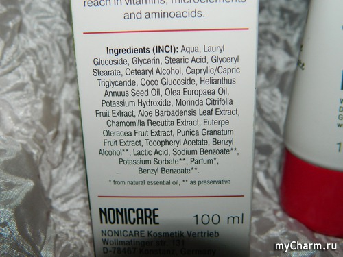А происходит так благодаря великолепным компонентов, входящим в состав крема. Это уже хорошо знакомые нам сок фруктов нони, экстракт ягод асаи и граната. Все они обладают уникальными увлажняющими и замедляющими старение кожи свойствами. Немало хвалебных слов можно сказать и об экстрактах алоэ и ромашки: оба они действуют мягко, хорошо очищают, обладают противовоспалительным действием. Масла оливы и подсолнечника способствуют той самой деликатности средства, которая присуща омолаживающему крему. Так что крем подойдёт даже самой требовательной и чувствительной коже.