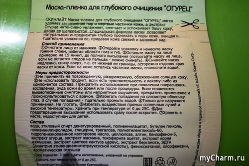 Пакетик-саше переливается персиково-салатовыми тонами. Вдобавок к этому на нем есть изображениями огурчиков и мини-картинка, повествующая о пленочном типе маски. А это было немаловажным фактом для меня. Пленочные маски мне кажутся гораздо удобнее, чем кремообразные и гелеобразные.