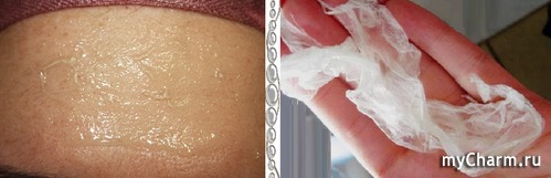 На коже маска почти незаметна. Первое время она блестит прозрачным слоем на лице, а по мере впитывания становится словно вторая кожа. Согласно рекомендации, достаточно держать её всего 15 минут, но я отдыхала и больше, надеясь на более продолжительное воздействие. Затем аккуратно берем образовавшуюся пленочку за нижний края и постепенно снимаем. На вид это покрытие очень напоминает кожицу, которая сползает с обгоревшего на солнце человека. Многим знакома эта картина. Если на лице остаются маленькие отдельные частички маски, то следует умыться прохладной водой. Так вы освежитесь и удалите маску полностью.