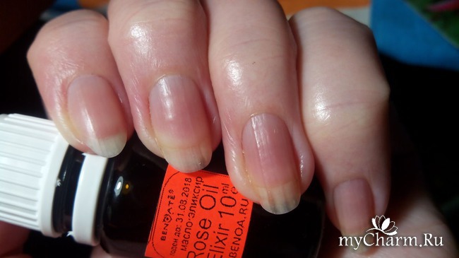 Первым делом я испытала данное масло на ногтях. Наносила по капельке на ногтевую пластину и массажными движениями втирала в ногти, кутикулу и ногтевые валики. Впитывается масло не быстро, но зато прекрасно питает и смягчает кожу, а также хорошо укрепляет ногти. Я чередовала данное масло с бальзамом по уходу за ногтями, и эффектом очень довольна. Ногти стали значительно крепче, а валики более ухоженными.