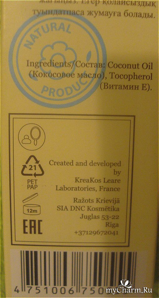 Состав "Кокосовое масло для волос, лица и тела". И снова DNC порадовал меня натуральностью компонентов. В составе данного продукта всего лишь два компонента: кокосовое масло и витамин Е (токоферол).