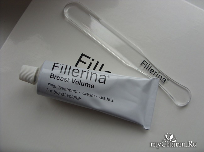 Набор Fillerina Breast Volume, кстати, представлен в шкатулке (я назову ее именно так) лаконичного дизайна. Под крышкой располагается два уходовых продукта и 2 аксессуара для их применения. Под уходовыми продуктами скрываются – гель для увеличения объема груди в стеклянной емкости объемом 50 мл и крем для увеличения объема груди в мягкой металлической емкости объемом 50 мл. Для первого в упаковку-шкатулку вложены градуированный аппликатор и лопатка для распределения.Принцип «работы»
