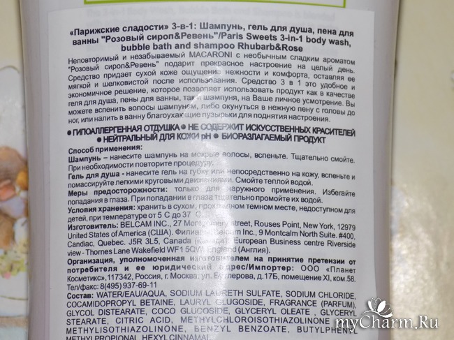 Самое приятное в Шампуне, геле для душа, пене для ванны "Розовый сироп&Ревень", что он, как и все средства Belcam Bath Therapy не содержит парабенов, фталатов, пропилена гликоля, продуктов нефтепереработки, формальдегида, глютена. Это ли уже не счастье? Иметь возможность недорого приобрести косметику в большом объеме, безвредную для кожи и волос? Да еще с таким разнообразием ароматов во флаконах, их потрясающими сочетаниями.