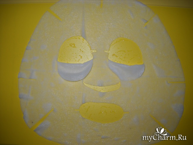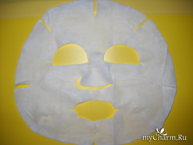 Вот так выглядит маска перед тем, как нанести ее на лицо. Отчетливо видно, что пропитана она действительно от души. Разумеется, кожу лица перед использованием данной маски следует хорошенько очистить, чтобы увлажняющим и питательным веществам было легче проникнуть в нее.