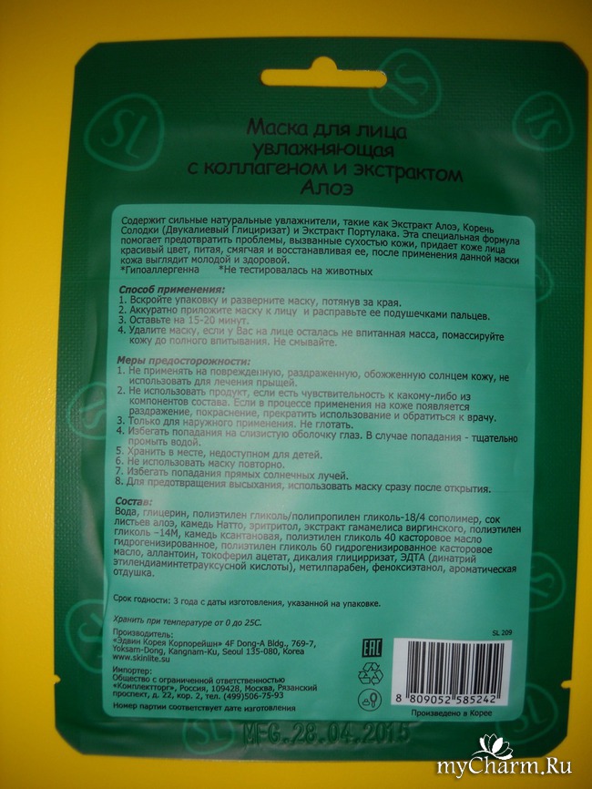 А вот предостережение насчет того, чтобы потребитель не глотал маску, думаю, совершенно излишнее, так как она не жидкая, а нанесена на целлюлозную основу. Хотя, конечно, бывают и странные люди, мало ли, кто-то решить вкусить волшебную маску…