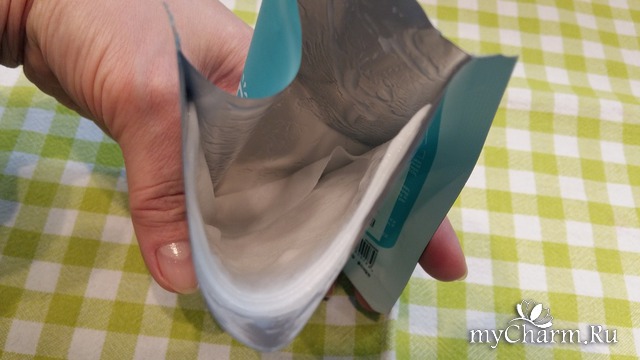 Маска находится как обычно в одноразовом пакетике из плотной фольгированной бумаги. Упаковка симпатично оформлена в нежных бело-голубых тонах и очень приятная на ощупь.