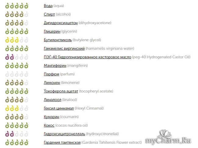 Компоненты в этом средстве довольно неплохие. Основная масса ингредиентов натуральные, либо безопасны для здоровья человека. Проверила состав на сайте экоголик, из всех компонентов только два не одобрены: ПЭГ-40 Гидрогенизированное касторовое масло – повышает проницаемость кожи и Гидроксицитронеллаль - ароматизатор с цветами ландыша. Эти средства в худшем случае могут вызвать аллергию. Чтобы избежать неприятностей, советую сделать тест на небольшом участке тела и затем применять средство, если нет аллергии.Остальные компоненты вполне безопасны и более того, несут пользу нашей коже.