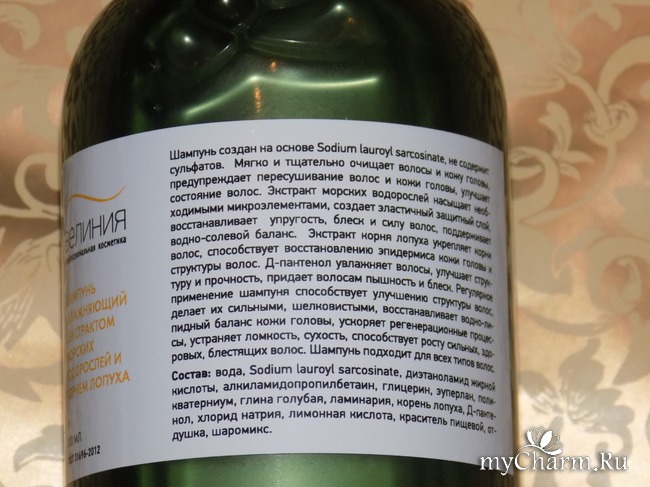 Мылкость у шампуня создают не сульфаты, а вещество - Sodium lauroyl sarcosinate, мягко очищающее волосы. Запах у шампуня прямо таки травяной. Ничего лишнего. Будто заварила нарезанный корень лопуха, настояла и втерла его в волосы. Но кроме ценного отвара (его экстракта) корня лопуха, который, как мы знаем, способствует восстановлению структуры волос, укрепляет их корни - шампунь содержит экстракт морских водорослей. Водоросли, добытые прямиком из Белого моря, обработаны на производстве «Велинии» так, чтобы сохранялись все их полезнейшие элементы. Этот морской экстракт, как фон шампуня, создает защитный слой для волос от негативных факторов, восстанавливает упругость волос, придает блеск им. Чем чаще использовать шампунь, тем скорее можно будет убедиться, что волосы раз от разу становятся более шелковистыми и сильными.