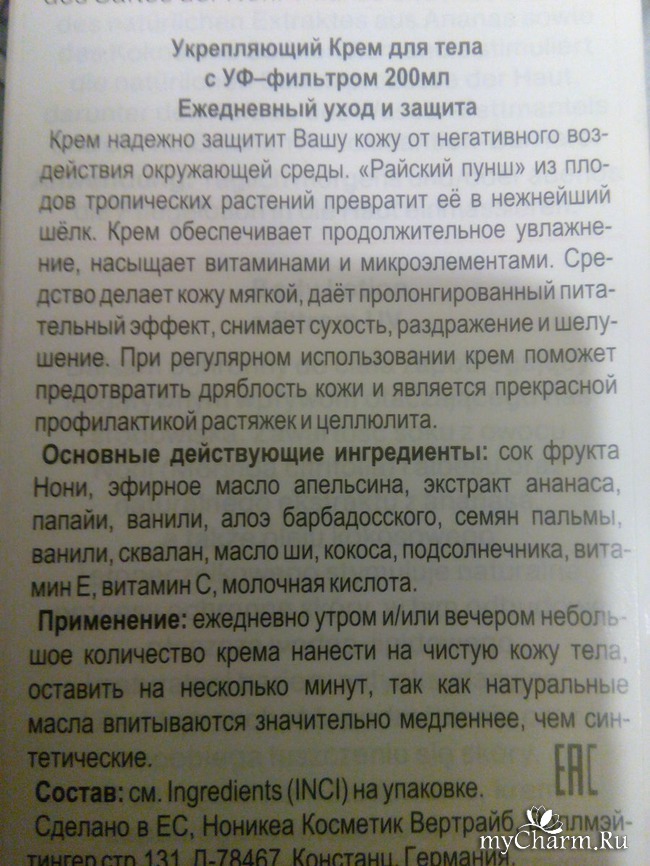 Мои выводы. Укрепляющий крем для тела с УФ-фильтром "Ежедневный уход и защита" показал себя как отличное увлажняющее, питающее и тонизирующее средство для тела. В процессе его использования кожа получает недостающие ей питательные вещества и витамины, устраняются мелкие повреждения и сухость. Прошло не так много времени, а моя кожа стала гладкой и приятной на ощупь. Буду пользоваться им и дальше, чтобы сохранить полученный от применения эффект, чего и вам желаю!