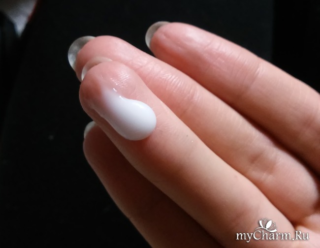 Как видно, крем белого цвета. Запаха у него почти нет. Если только принюхиваться, можно уловить свеженький аромат... Есть в нем что-то немного, мне показалось, виноградное. Крем имеет очень легкую консистенцию и мгновенно впитывается.
