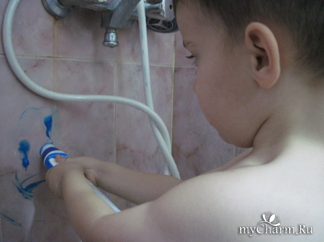 Откровенно говоря, мой сын не ярый поклонник банных процедур. Хотя в целом он любит плескаться в воде, тот факт, что нужно мыть голову, часто заставляет его затевать скандал при слове «мыться». Но в этот раз скандала не было – после того как показала, что волшебной краской можно рисовать! Сын начал со стенок!