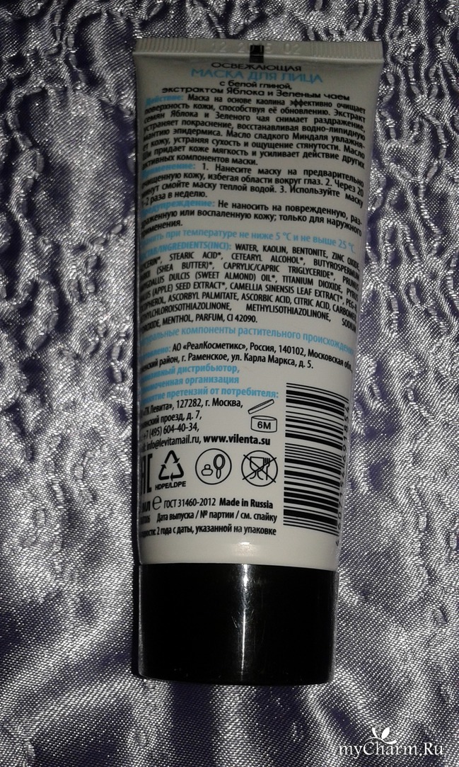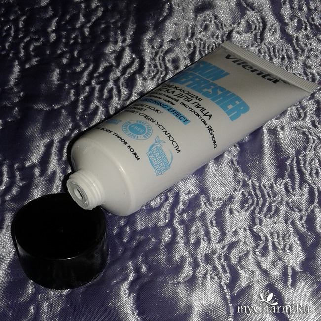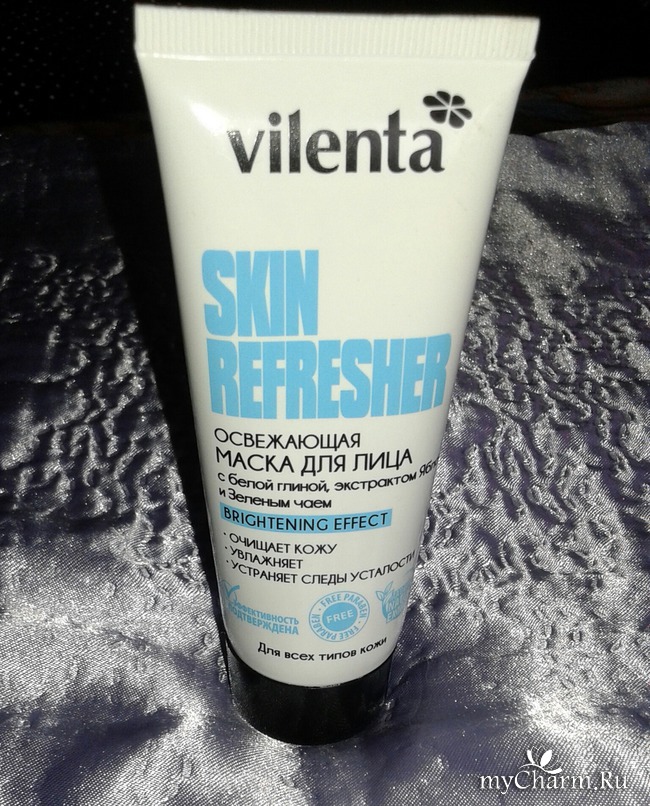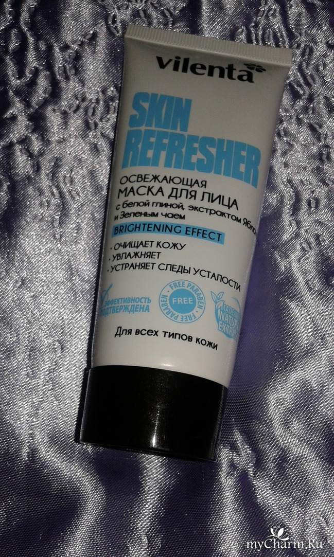 Итак, маска для лица Skin Refreshener от Vilenta находится в мягком белом тюбике. Надписи на упаковке сделаны в спокойных черных и голубых тонах, что очень приятно для глаз. Имеется черная, откручивающаяся крышечка, само средство выдавливается весьма легко.