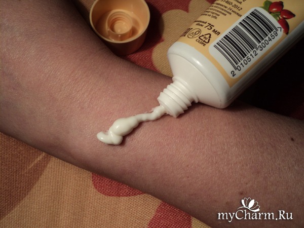 Упаковка обычная и средство очень бюджетное, и внутри я тоже ожидала что-то стандартное для доступного продукта. Как правило, это что-то похожее на детский крем (желтоватое, жирноватое и пр.). Но консистенция меня приятно удивила.Это, конечно, не гель и не эмульсия, но крем очень легкой и не жирной текстуры. И белого оттенка!
