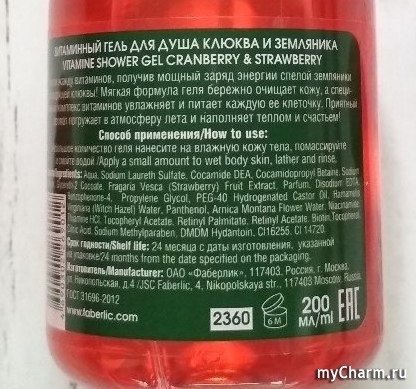 Стоит остановиться и на составе геля. Название VitaMania серия косметических продуктов получила не просто так: в составе средств действительно содержатся витамины и натуральные компоненты, заботящиеся о красоте и здоровье кожи. Например, в геле для душа «Клюква и земляника» имеются витамины А, Е, РР, экстракт земляники, гидролат гамамелиса, цветочная вода арники горной, пантенол. Эти ингредиенты оказывают на кожу заживляющее, противовоспалительное, очищающее, успокаивающее, восстанавливающее, регенерирующее воздействие, что в городских условиях жизни просто необходимо. Поэтому пользоваться таким средством не просто приятно, но и полезно. Все эти компоненты действительно работают: после душа кожа чистая, мягкая и увлажненная, и даже нет необходимости применять какие-либо дополнительные средства.