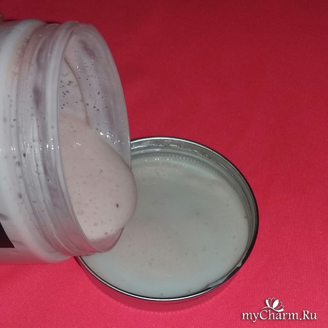 Текстура у данного продукта необыкновенно легкая, воздушная и пористая. По консистенции маска похожа на йогурт, впрочем им же она и пахнет, кисло - сладкими тропическими фруктами. Маску удобно доставать из банки и распределяется по волосам она очень легко.