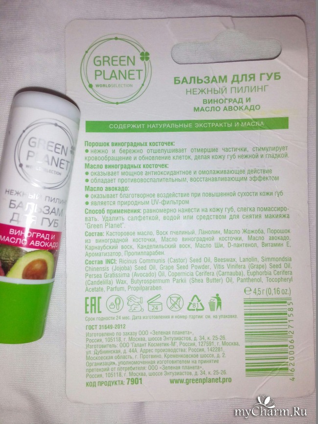 Помимо того, что бальзам является пилингом (но пилинг - это мягко сказано), он еще и отлично питает кожу губ, делает ее мягкой и гладкой. Масло виноградных косточек, входящее в состав продукта, оказывает омолаживающее и антиоксидантное действие, снимает воспаления и восстанавливает клетки кожи, а масло авокадо в составе увлажняет и питает и от природы является UV-фильтром.