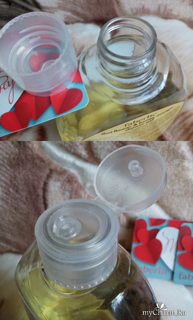 Гель налит в небольшой флакон, объемом 310 мл. Флакон совершенно прозрачный, поэтому виден расход геля. На лицевой стороне название фирмы изготовителя и название средства, а так же изображен тот самый Тайский цветок и плод манго.