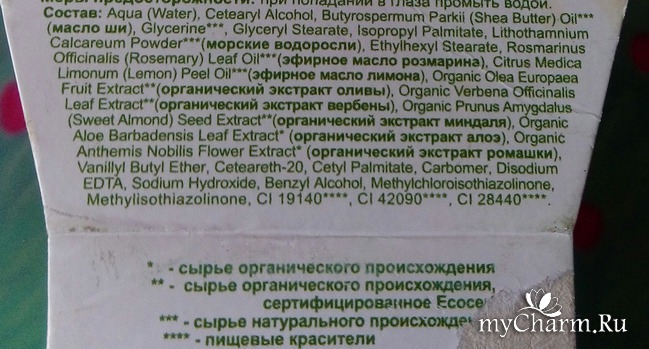 Взглянем на состав: достаточно объёмный список, содержащий эфирные масла, сырьё органического и натурального происхождения. И всё это перечислено в верхней части состава, что говорит об их достаточной доле в продукте: