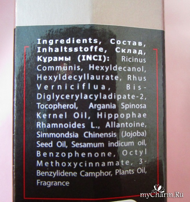 Картонная коробочка, оформленная в темных тонах, сразу привлекает внимание, да и возможность увидеть на месте покупки цвет самого средства (желтый и согревающий — как солнышко), его форму выпуска тоже радует. Обещание, что масло сделает ногти красивыми и здоровыми привлекает. В общем, сама не заметила, как это средство оказалось у меня в корзине, ведь моей целью было купить что-то интересненькое для укрепления ногтей, а получилось — обычное масло. Или необычное? Ответ на этот вопрос дадут впечатления каждой женщины от использования и состав средства, ведь результат результатом, а состав для многих важен.