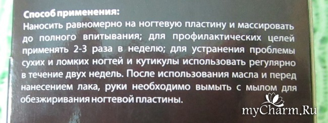 Применять масло просто: нанес на ноготки, аккуратно вмассировал и можно заниматься своими делами, убрав остатки средства салфеткой или — лучше — смыв водой, но я люблю оставить маслице на ноготках, пока оно не впитается само — отличный способ пересмотреть любимый фильм или оценить киноновинку, не отвлекаясь на посторонние дела, да и родные, видя ситуацию, не беспокоят просьбами приготовить чайку.