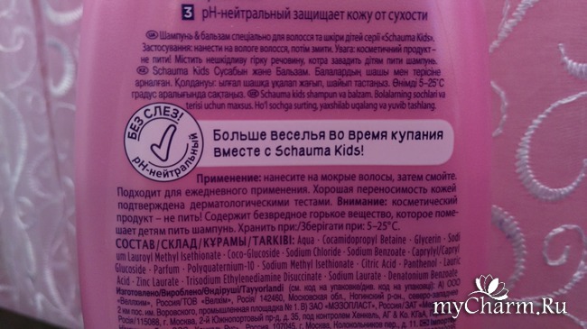 Состав данного шампуня-бальзама все-таки отличается от большинства других составов, не скажу, что он идеальный, но все же получше некоторых. Конечно, это не натуральный шампунь, впрочем, и цена у него была бы намного выше, если бы шампунь был натуральным, а также сократился бы срок годности данного средства. Но все же данный шампунь-бальзам не содержит привычных уже для многих сульфатов и пропиленгликоля и нет красителей в составе, что несомненно радует меня.