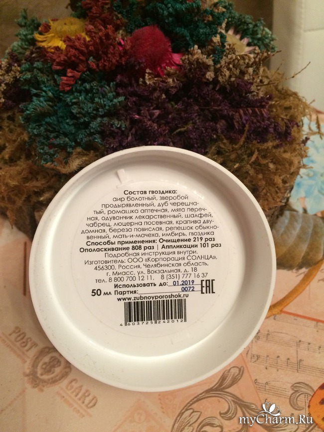 Теперь о самом продукте. Как я уже говорила, зубной порошок состоит полностью из трав, а именно из четырнадцати трав плюс гвоздика. У меня порошок именно с таким вкусом. Итого получается даже пятнадцать.