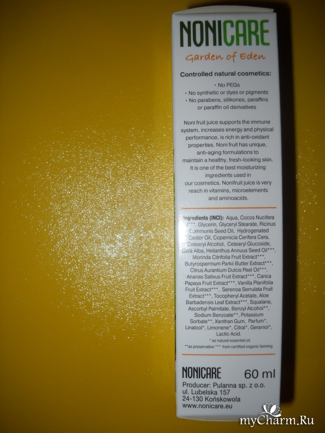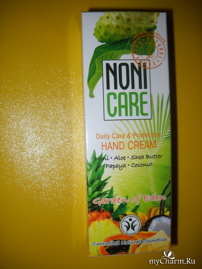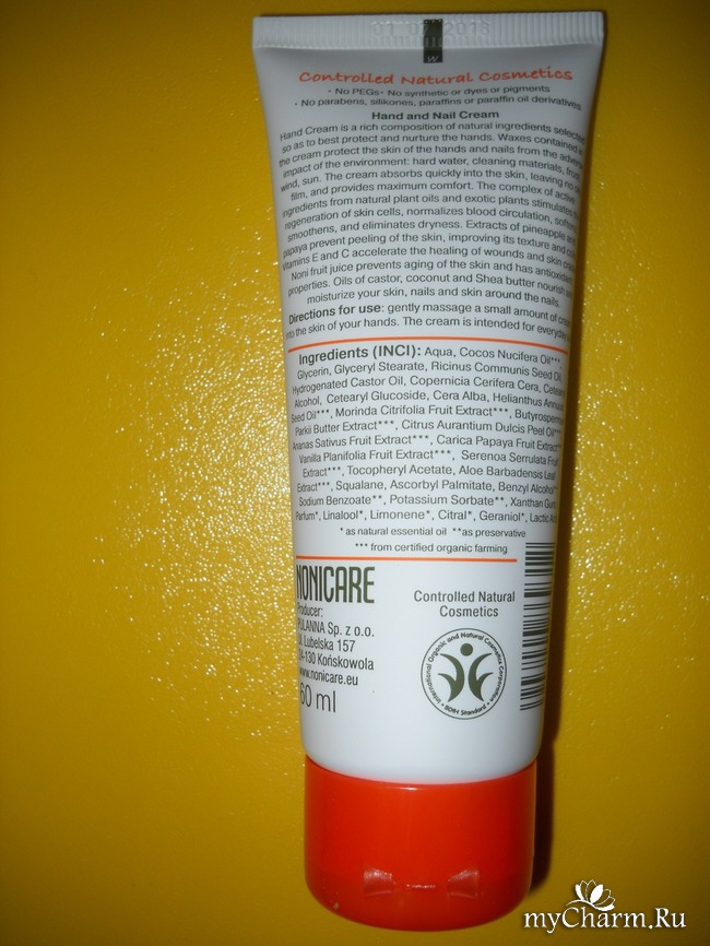 А на обратной стороне упаковки можно найти подробную информацию о продукте уже на русском языке – заботливый производитель постарался снабдить упаковочку соответствующей наклейкой. Из нее следует, что основными действующими ингредиентами крема для рук от Nonicare являются молочная кислота, глицерин, сквалан, карнаубский и пчелиный воски, а также витамины C и E. Кроме того, в составе чудодейственного крема присутствуют экстракты алоэ, папайи, ананаса, карликовой пальмы и ванили, а также сок невероятно привлекательного фрукта Нони и различные масла: касторовое, ши, подсолнечника, семян клещевины, кокоса и кожуры сладкого апельсина. Бесподобный состав, не правда ли?