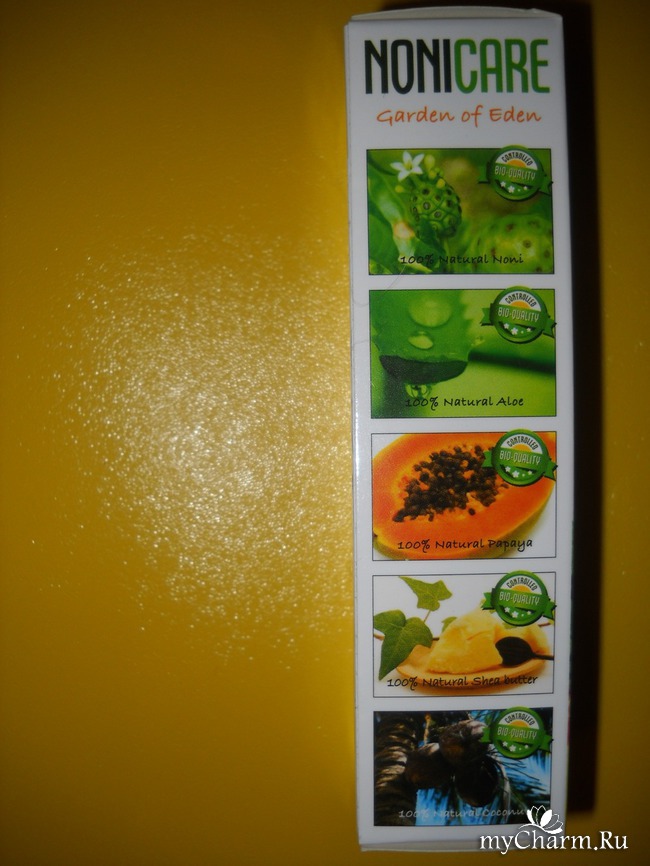 Еще с одной из сторон упаковки имеется подробная информация о креме на английском языке. Тем не менее, даже далекий от владения этим языком человек без особого труда может разобрать, что в составе крема для рук от Nonicare отсутствуют силиконы, парабены, парафины, красители и всевозможные синтетические компоненты. Здесь же можно ознакомиться и с составом, в котором найдутся экстракты таких чудесных тропических фруктов, как папайя, моринда, ананас, сереноа и т. д. Настоящий райский сад, не иначе!