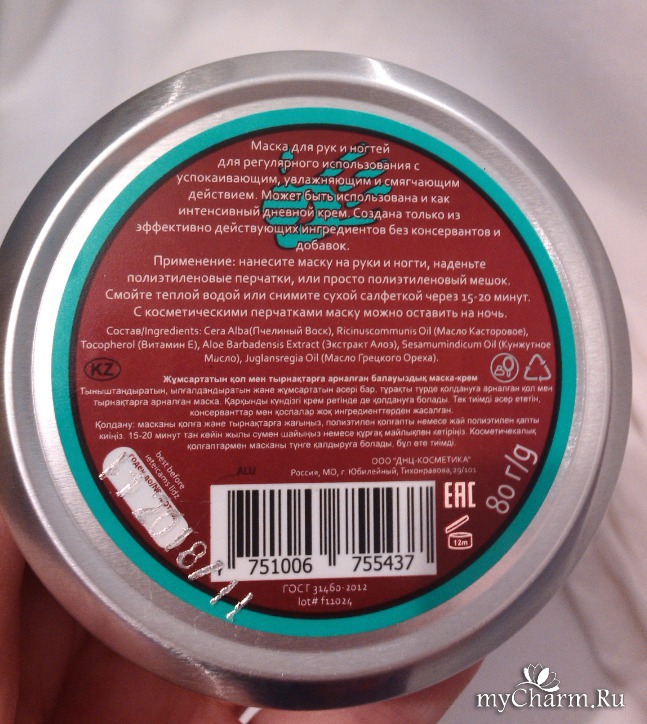 При использовании данного средства будьте готовы к тому, что это маска-воск, это не крем, к которому мы привыкли и любим, когда он быстро и без остатка впитывается. Процедура применения маски займет как минимум 20 минут. Маска-крем будет ложиться на кожу пленкой и до конца не впитывается. Для получения первых видимых результатов воздействия маски придется подождать около 20 минут, затем удалить средство салфеткой или смыть. Поэтому проводя данную процедуру, запаситесь свободным временем и отложите текущие дела, доставьте себе немного удовольствия и ухода за вашими ручками. Расход у маски не большой, распределяется хорошо.
