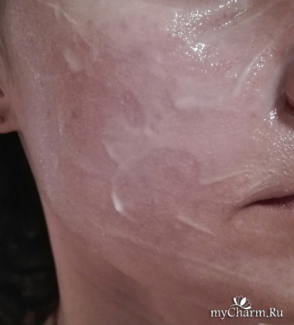 Примерно за пару часов до сна я на чистую кожу лица и шеи наносила маску. Посмотрите, как масса тонким слоем покрывает кожу.