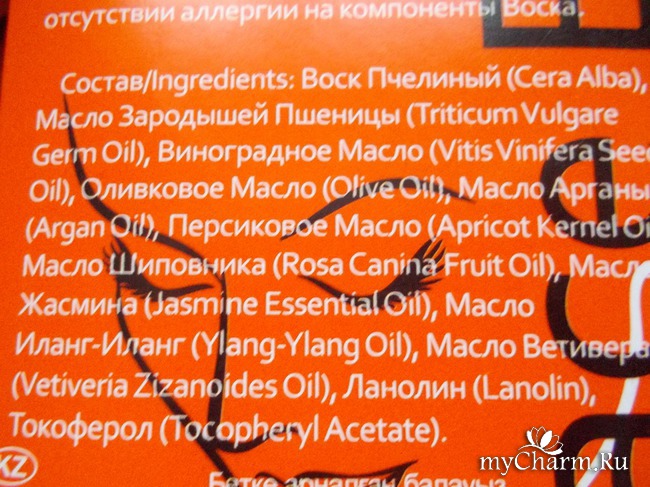 Очень понравился воск для лица, который включает в себя набор масел: 1)зародышей пшеницы, 2)виноградное, 3)оливковое, 4)масло арганы, 5)персиковое, 6)шиповника, 7)жасмина, 8)иланг-иланга, 9)ветивера, 10)воск пчелиный, 11)ланолин, 12)токоферол.