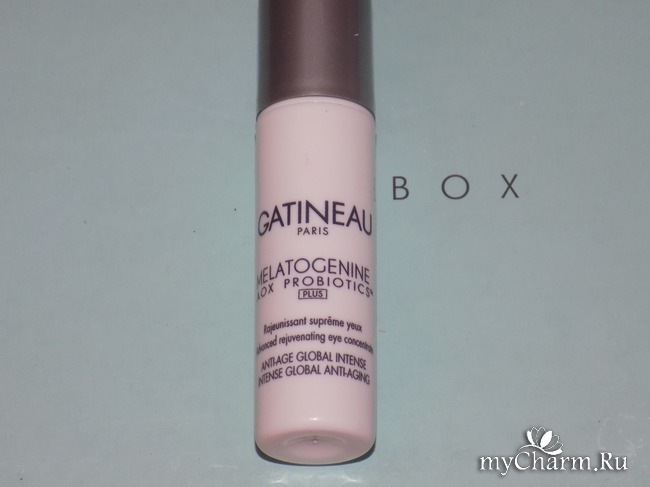Дорогое и весьма средство в этом выпуске коробочки, я бы сказала, королевское - Сыворотка для глаз Melatogenie AOX Probiotics Gatineau. У меня флакончик в 5 мл с дозатором.