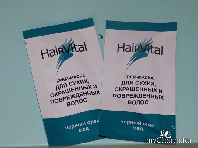 Следующие продукты в коробочке. Два саше Крема-маски той же марки Hair Vital по 10 мл каждый, предназначенной для сухих, окрашенных и поврежденных волос с экстрактом черного ореха, витаминами С, В1, В1, РР, каротином, медом. Оба пробничка стоят 50 рублей.