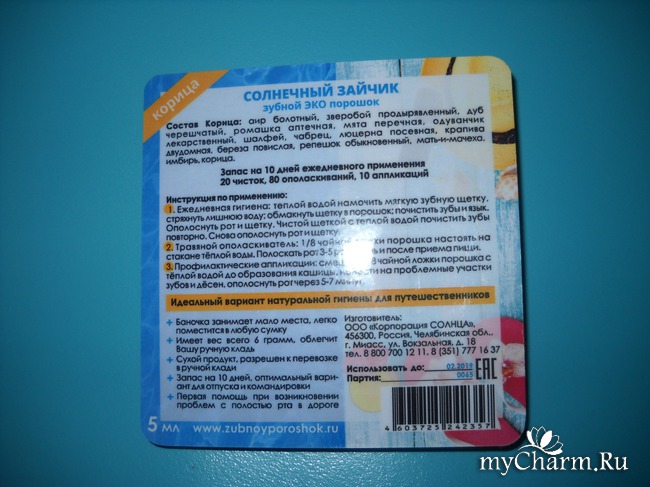 Кстати, если сохранить мини-упаковку от такого зубного порошка, в нее можно будет насыпать порошок из больших баночек для следующих путешествий! Отличная идея – не надо ломать голову над тем, где взять мини-емкость хотя бы для этого средства гигиены! Огромное спасибо производителю за столь оригинальное решение и за такой великолепный продукт!