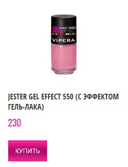 Лаки для ногтей от Vipera Cosmetics JESTER Gel Effect. Цветовая гамма лака плотного розового цвета под № 550. Палитра данных лаков, основана на весенних тенденциях 2015 года. В составе коллекции насчитается 15 изящных оттенков.